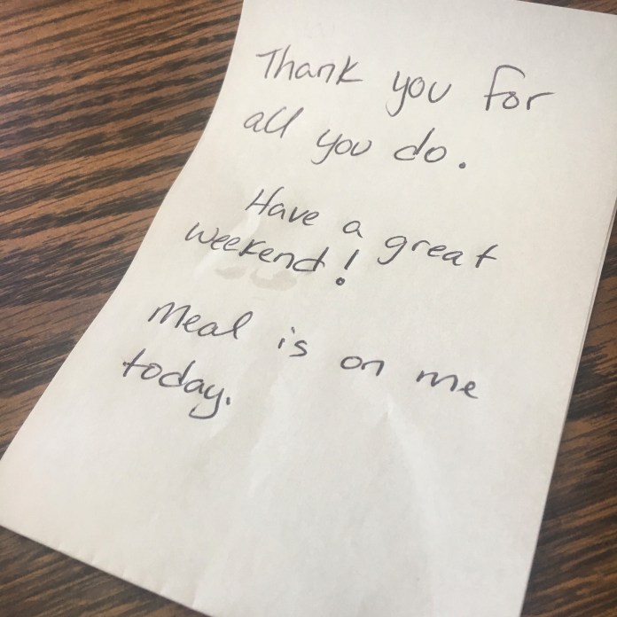 After quickly eating my meal I headed up to the register. The manager, Renee, smiled and told me that there was “no charge.” Someone had paid for my lunch and left me a note.